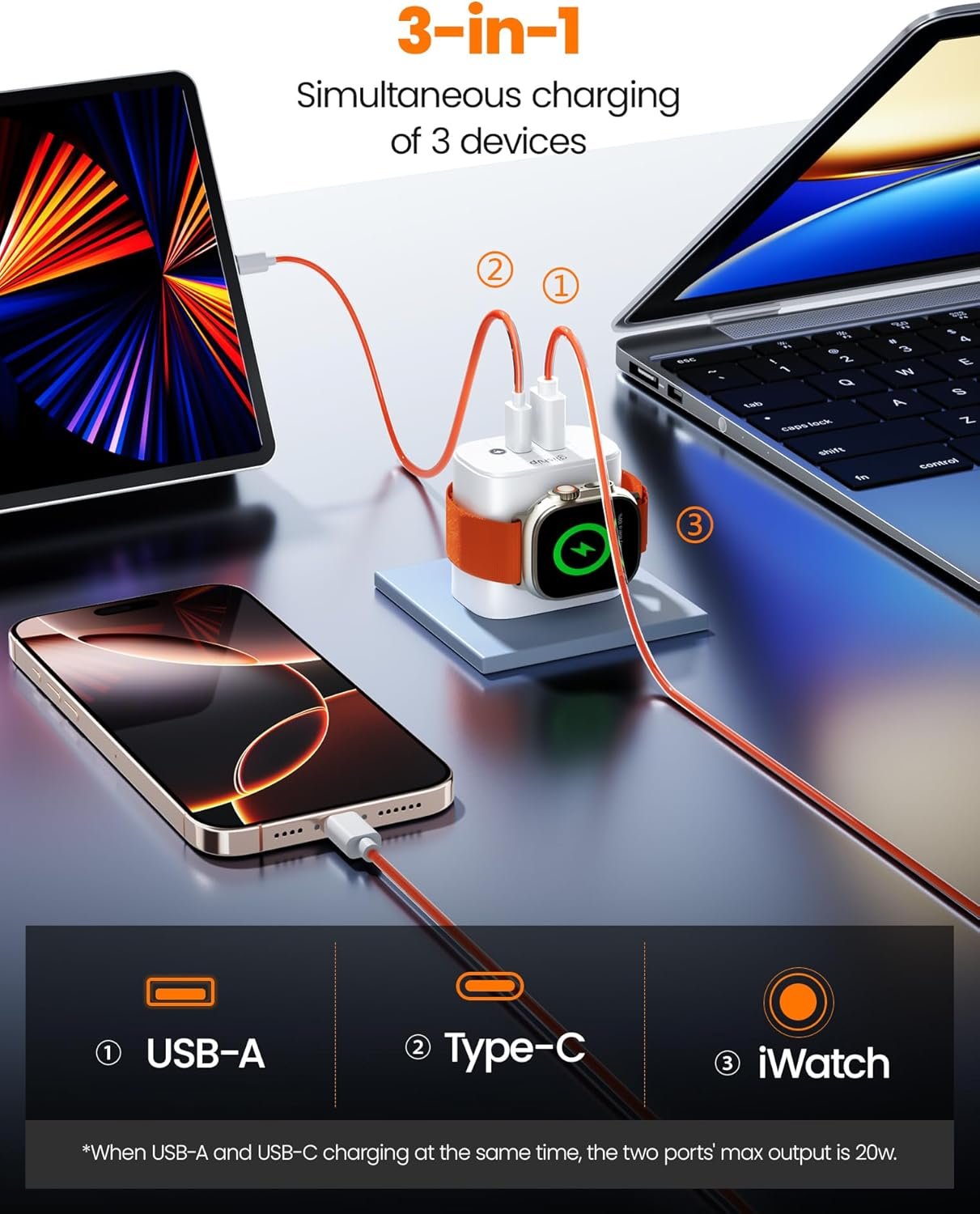 【Wide Compatibility】Compatible with Apple Watch Series 8 SE 7 6 5 4 3 2 1 (38mm, 40mm, 41mm 42mm & 44mm), also for iPhone 15 14 13 12 11 Pro/Pro Max/Mini/X/8, AirPods, Samsung and Android, tablets. Allows you to easily charge different devices simultaneously while eliminating confusion when using different chargers & multiple devices!