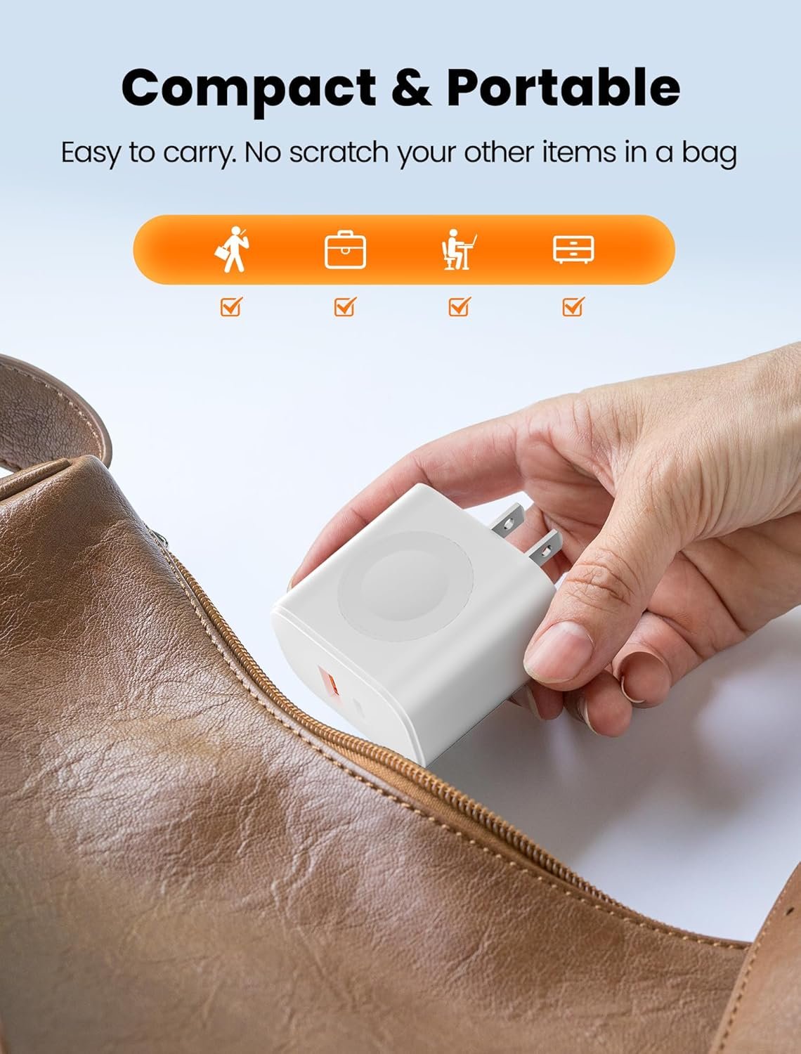 【Upgraded Apple Watch Charger】Upgraded cordless charger block with a built-in 3W magnetic wireless charger stand, compatible with Apple Watch. No extra cables are needed, allowing you to easily charge your iWatch at home, in the office, or while traveling. (This wireless charger only supports Apple Watch)