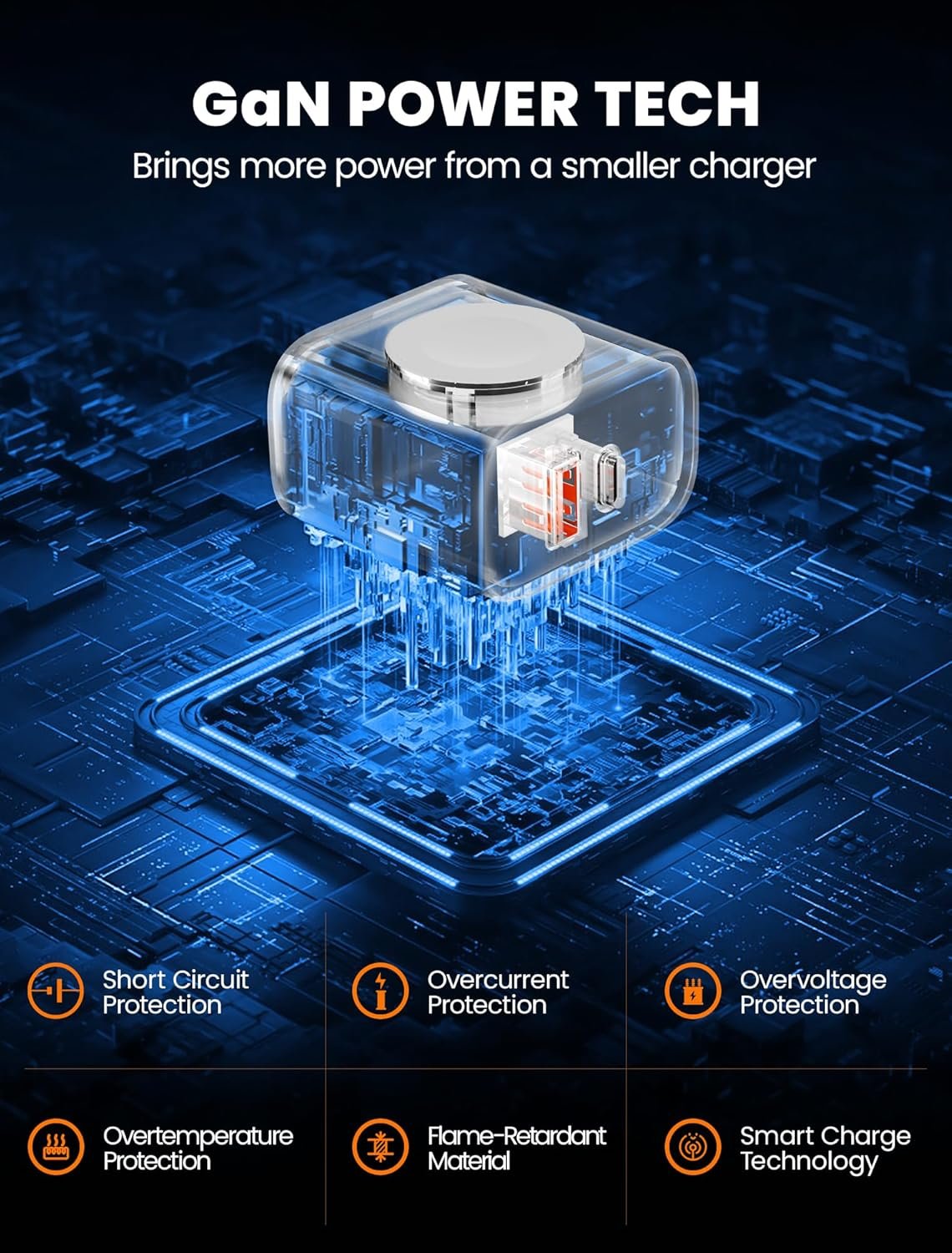 The USB-C charging port supports fast charging for most PD devices. 20W USB C +18W USB A+3W Wireless for Apple Watch.