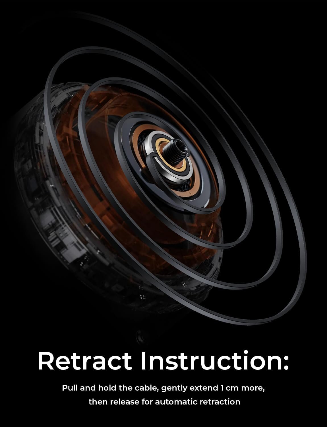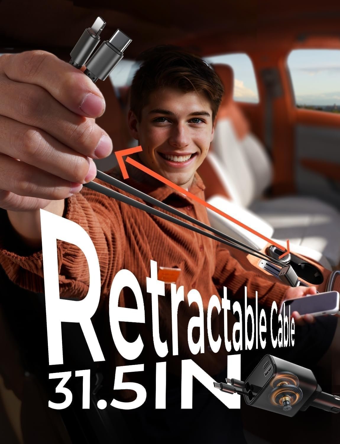 69W 4 Port Car Charger: Equipped with a 30W PD USB C port, a 12W USB A port, and additional charging options, this powerhouse charges up to four devices simultaneously. Ideal for fast charging the iPhone 16 Pro Max or other gadgets, it’s versatile enough for truck accessories or stylish car essentials. Its smart power distribution maintains high speed charging across all ports. Retract Instruction: Pull and hold the cable, gently extend 1 cm more, then release for automatic retraction