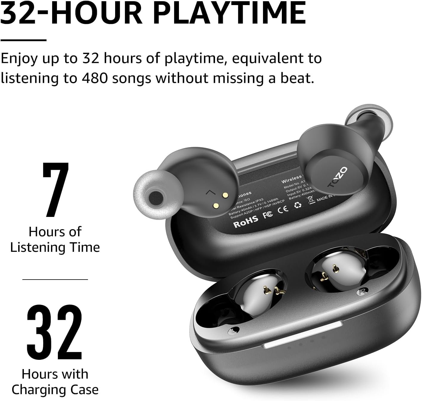 [Stereo Sound Quality] TOZO A1 earbuds’6mm diameter speaker presents a powerful and wide sound range, which makes the treble full of dynamics, and the bass powerful.Adopt advanced Bluetooth chip makes the sound played by the earphones much more beautiful and pleasant, suitable for sports or home work.